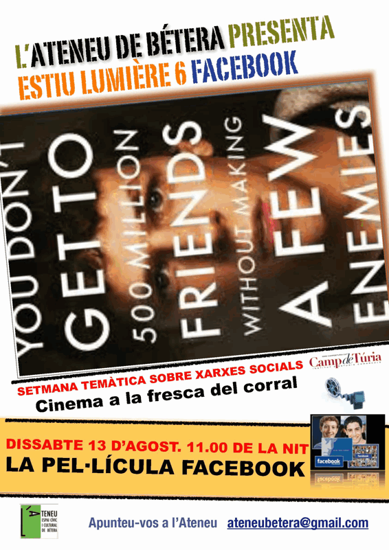 El dissabte 13 d’agost a la nit hem preparat una sorpresa, dins el cicle de cinema Estiu Lumière. Al fil de la setmana dedicada a internet i a les xarxes socials, projectarem el film The Social Network (2010), de David Fincher. La pel·lícula, guanyadora d’uns quants guardons, explica la història de Facebook.