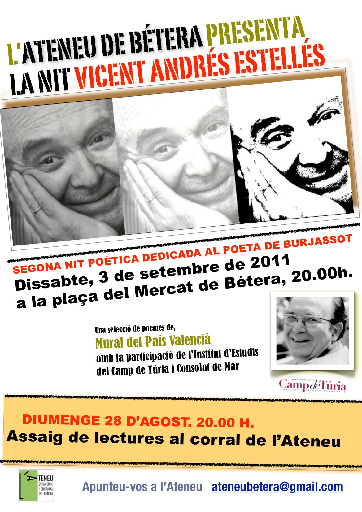 Vos recordem que enguany l’Ateneu celebrarà la II Festa Estellés, dedicada al poeta de Burjassot Vicent Andrés Estellés, en col·laboració amb l’Institut d’Estudis Comarcals del Camp de Túria i Consolat de Mar. Serà el dissabte 3 de setembre, a les 20.00, a la plaça del Mercat. Farem una lectura col·lectiva de poemes d’Estellés, del llibre Mural del País Valencià, menuts i grans. Ho hem preparat amb devoció i la nit promet, rememorant la veu d’un dels nostres poetes més destacats.