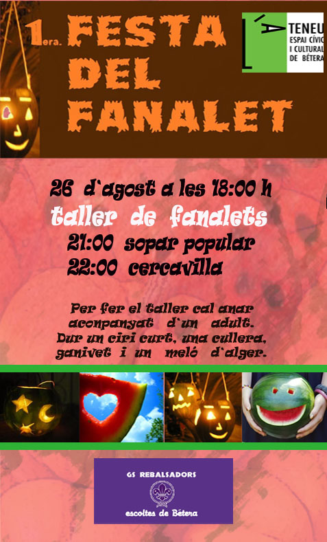 El proper divendres 26 d’agost farem la primera festa del fanalet, en col·laboració amb el grup escolta GS Rebalsadors. Per iniciativa dels escoltes, apostem per recuperar aquesta antiga celebració espontània de les nits d’estiu en què els menuts, amb l’ajut dels grans, elaboraven fanals amb melons i després feien una cercavila. La festa és oberta a totes les famílies que vulguen participar.