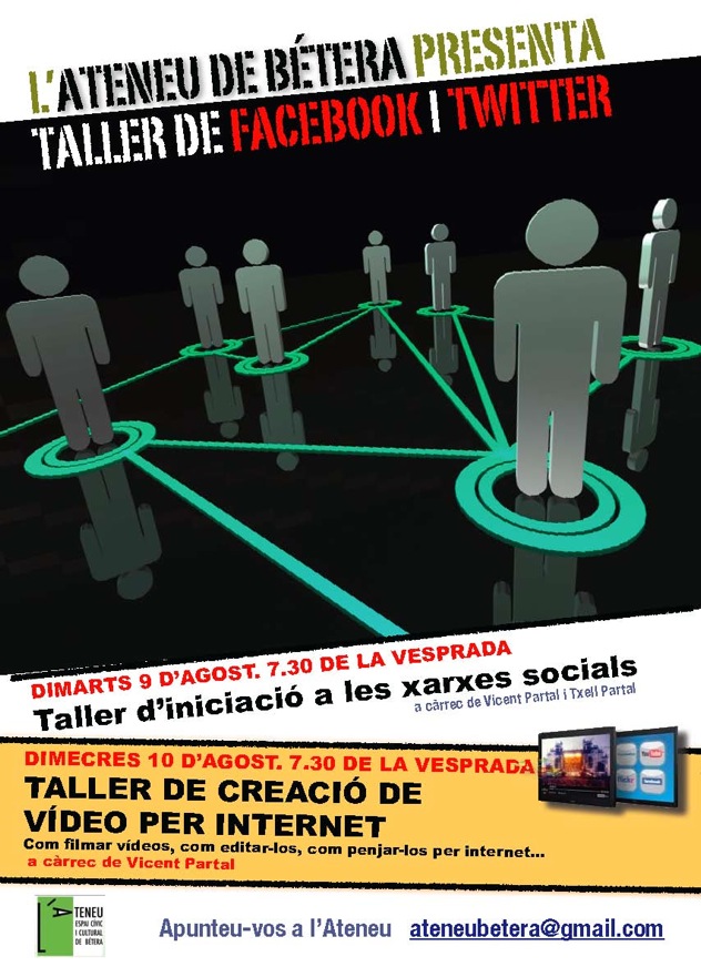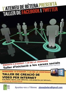 Dimarts 9 d’agost, a les 19.30. Coneixes bé totes les funcionalitats del Facebook? Saps com funciona Twitter?.  Taller d’iniciació a les xarxes socials a càrrec de Vicent Partal i Txell Partal.