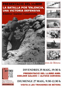 > El divendres, 25 de maig, a les 19.30, Edelmir Galdon ens presentarà La Batalla por Valencia, una victoria defensiva (Publicacions de la Universitat de València). El llibre és tota una novetat en la literatura història valenciana, i en la de la Guerra Civil en particular. Galdon recupera els escenaris de la poc estudiada batalla per controlar la ciutat de València, i destaca l’alt valor estratègic de les fortificacions construïdes en torn al Cap i Casal. La presentació comptarà amb la participació de l’escriptor Alfons Cervera.