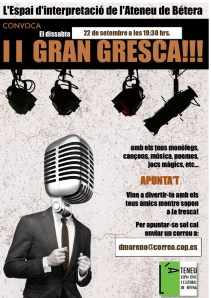 Dissabte 22 de setembre, des de les 19.30, torna la gran gresca a l’Ateneu. A l’escenari hi haurà música, poesia, monòlegs, jocs màgics, interpretació, etc. Ja sabeu, tothom pot participar de manera espontània. Encara vos podeu apuntar dmoreno@correo.cop.es.