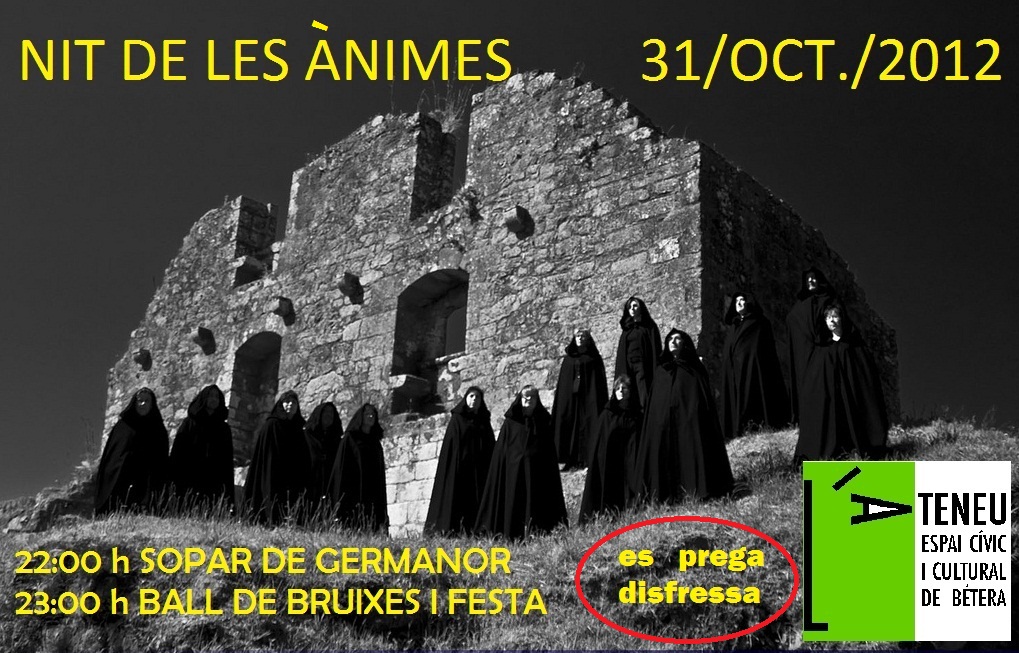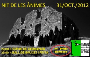 La nit del 31 d’octubre al 1 de novembre farem una festa de por: la nit de les ànimes. Hi haurà sopar de germanor, i després ball terrorífic. Es prega portar-hi disfressa.