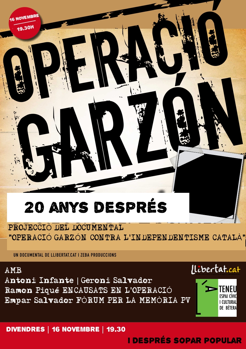 > El divendres 16 de novembre, a les 19.30, podrem conèixer a fons l’anomenada Operació Garzón. Es tracta de la ràtzia contra l’independentisme català feta l’any 1992, coincidint amb els Jocs Olímpics de Barcelona, ara fa vint anys. Una quarantena d’independentistes, alguns dels quals valencians, foren perseguits d’una manera indiscriminada sota l’acusació de pertànyer a Terra Lliure. El jutge Baltasar Garzón va aprovar la incomunicació dels vint-i-cinc detinguts, i dèsset van denunciar tortures. Garzón no en va fer cas i va donar per bones les declaracions fetes sota tortura. En l’operació es van vulnerar els drets humans dels encausats, com va sentenciar (pdf) el Tribunal Europeu dels Drets Humans d’Estrasburg dotze anys després, condemnant l’estat espanyol per haver vulnerat l’article número 2 de la Convenció contra la Tortura pel fet d’haver-se negat a investigar les denúncies per maltractaments, tot i les proves existents.