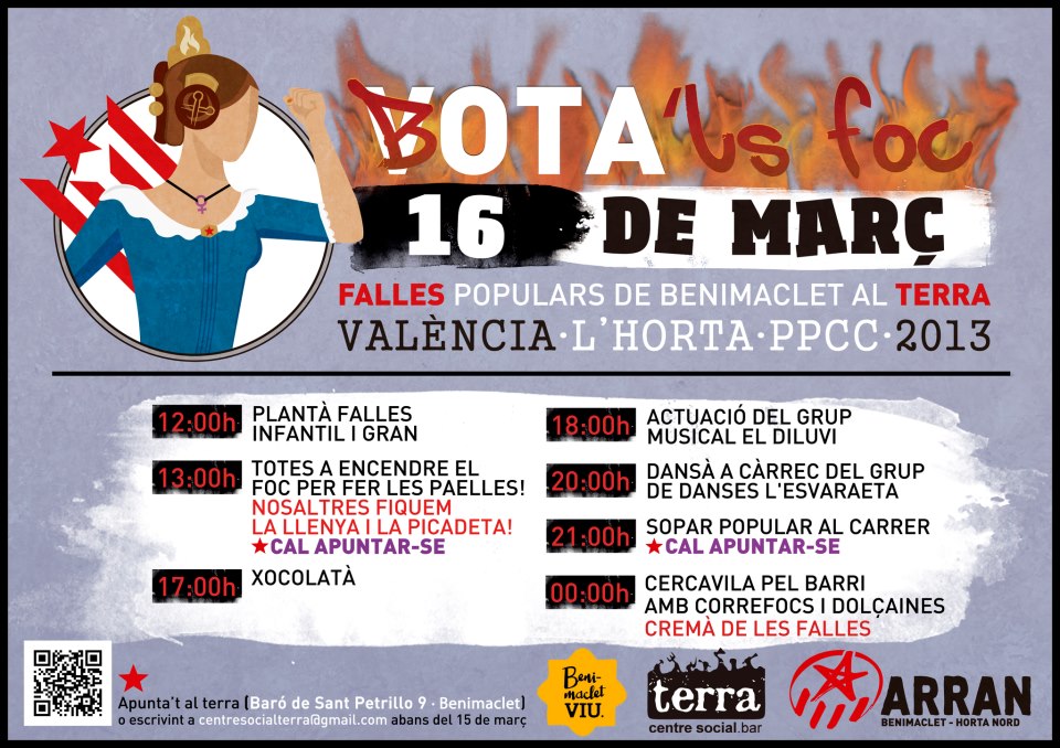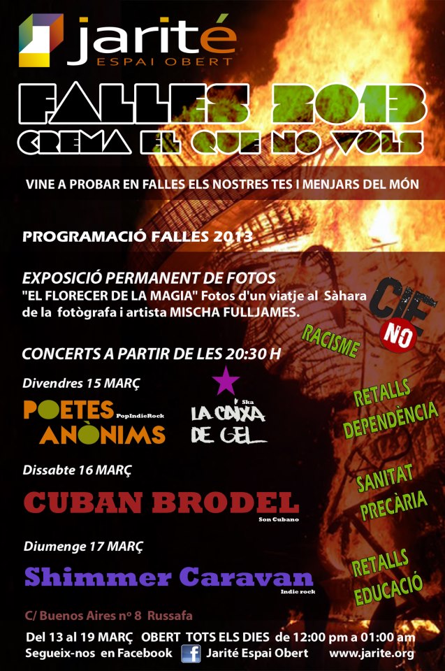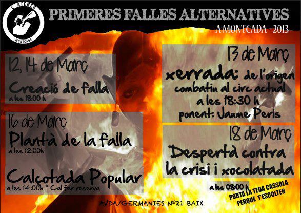 Més programes a València: la falla popular de Benimaclet, la falla multicultural de l’espai Jarité, a Russafa, i les falles universitàries contra el kapital. I més a prop nostre, la gent de l’Ateneu de Montcada de l’Horta ha preparat les primeres falles alternatives.