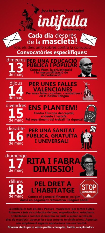 Però, no per tothom les falles són tan alegres; a les bones persones que acompanyen cada dia Rita al balcó de l’Ajuntament se’ls engargulla la mascletà. La Intifalla es convoca a la porta de l’Ajuntament, a l’hora de la mascletà. Cada dia tria un tema; el 13, per l’educació, el 14, per unes falles valencianes, el 15, plantada contra l’Europa del capital, el 16, per una sanitat pública i universal, el 17, Rita i Fabra dimissió, i el 18, pel dret a l’habitatge, Stop desnonaments.