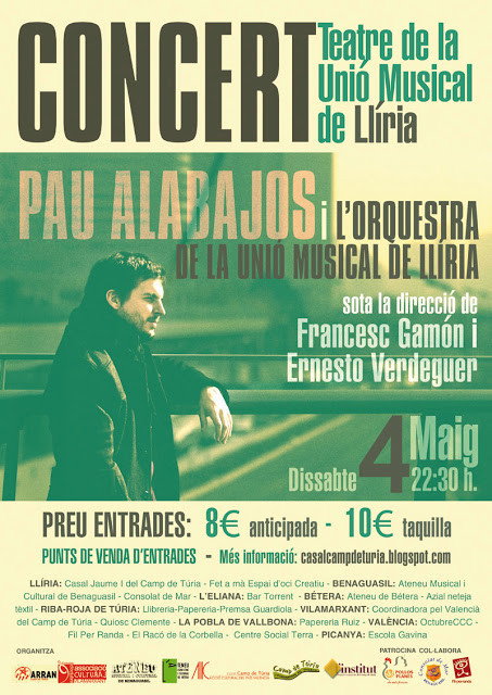 El dissabte 4 de maig actuarà Pau Alabajos al Teatre de la Unió Musical de Llíria, junt a l’Orquestra de la Unió Musical. Es tracta d’un nou concert, després del d’Obrint Pas del mes de març, que organitzem conjuntament col·lectius i entitats culturals de la comarca. A l’Ateneu hi ha entrades a la venda. Tota la informació, ací.