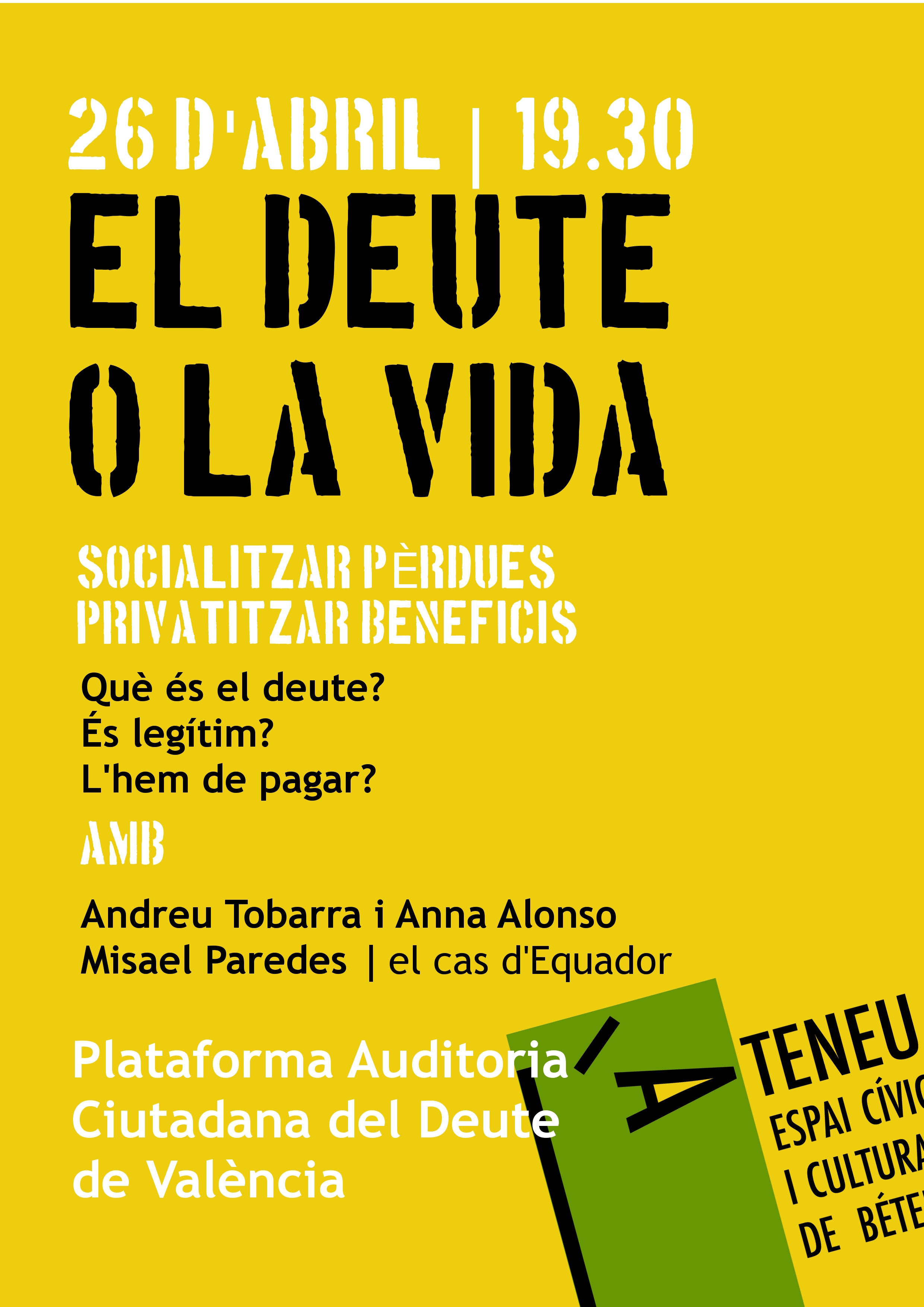 deuteolavida> El divendres 26 d’abril, a les 19.30, la Plataforma Auditoria Ciutadana del Deute de València ens presenta el col·loqui El deute o la vida. Què és el deute? D’on prové? L’hem de pagar, en un sistema capitalista que socialitza les pèrdues i privatitza els beneficis? Preguntes que mirarem de respondre amb la presència de Andreu Tobarra i Anna Alonso, i de Misael Paredes, que tractarà el ca d’Equador. La Plataforma opina que “el deute actual respon a un model patriarcal i capitalista que prioritza l’interès privat per sobre de la solidaritat, el medi ambient i les nostres vides. Davant les obligacions que implica el pagament del deute, volem obrir els “llibres” per conèixer les partides de pressupost públic, els préstecs acordats, les quantitats destinades a projectes irresponsables des d’un punt de vista social. Les Auditories son una eina d’apoderament on confluir des de diferents col·lectius, on sumar les forces de tothom que no vulga callar davant la injustícia que els interessos privats vagen davant d’allò que és de tothom”.