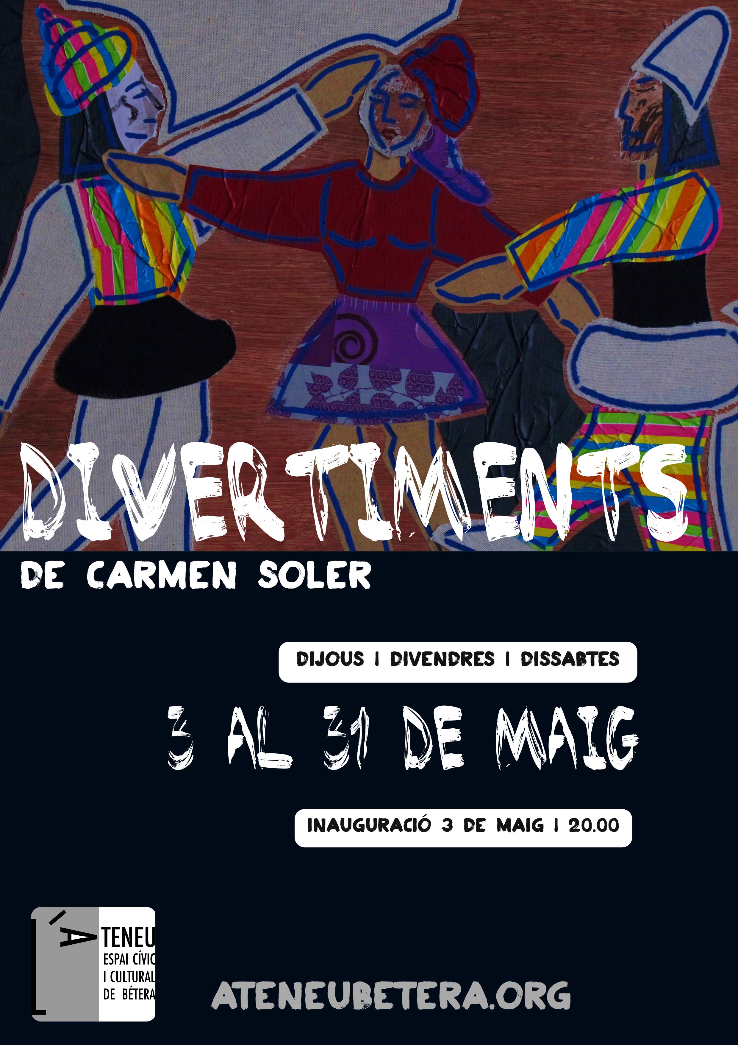 Es tracta de Divertimentsamb obra de Carmen Soler. En paraules de l’autora, és com un joc  on el dibuix, el retall i la pintura forma un conjunt divertit , tant per al que pinta com per a la persona que observa el resultat final del treball. Les diferents textures estableixen un diàleg constant amb les formes i els colors. El tema és quasi sempre la figura humana. perquè som un poc de tot, heterogenis. Primer faig l’esborrany del dibuix, després ve la part de les  proves experimentals que m’apropen al resultat final. En aquest procés creatiu es retroben distintes tècniques expressives: el collage, acrílics i guix. Els suports també són variats, ho podreu observar tot a l’exposició. L’exposició romandrà a l’Ateneu fins el 31 de maig, en l’horari habitual d’obertura.