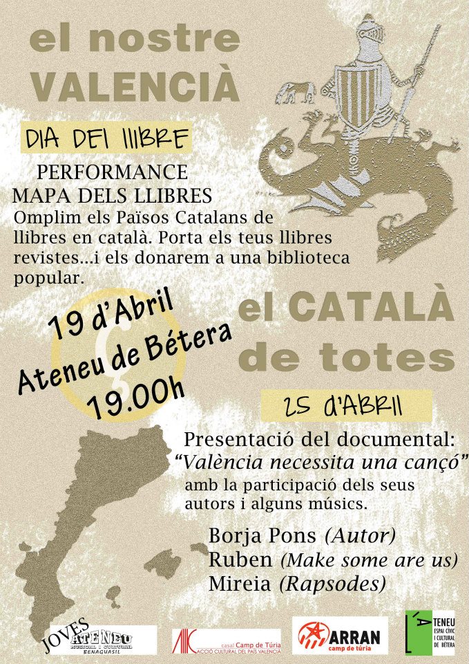 santjordi_2013El proper divendres 19 d’abril el Grup de Joves de l’Ateneu de Benaguasil, el Casal Jaume I de Camp de Túria, l’Ateneu de Betera i Arran Camp de Túria organitzem un seguit d’activitats en commemoració del 23 d’abril, dia del llibre; i del 25 d’abril, diada del País Valencià.