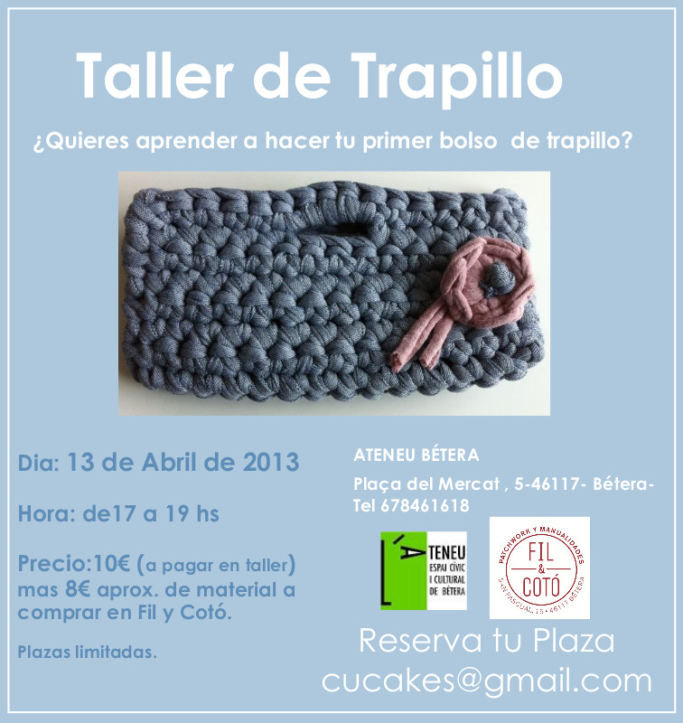 > I el dissabte 13 hi haurà un taller de drapet (“trapillo“) organitzat per Fil-i-Cotó. Atenció que cal inscriure’s amb anterioritat. Les condicions, al cartell del taller.