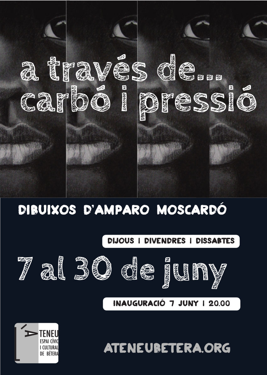 El divendres 7 de juny, a les 20.00, inaugurem una nova exposició: A través de…carbó i pressió, d’Amparo Moscardó. L’autora ens presenta la mostra: “En aquesta exposició desitge mostrar-vos un recorregut per la meua obra des de l’inici , començant fent dibuixos a carbó fins a l’actualitat. Ara, a  més, utilitze altres tècniques com el gravat calcogràfic i la monoimpressió. Com va dir A. Eistein: “L’art és l’expressió dels més profunds pensaments pel camí més senzill”. Espere que us agrade…”.