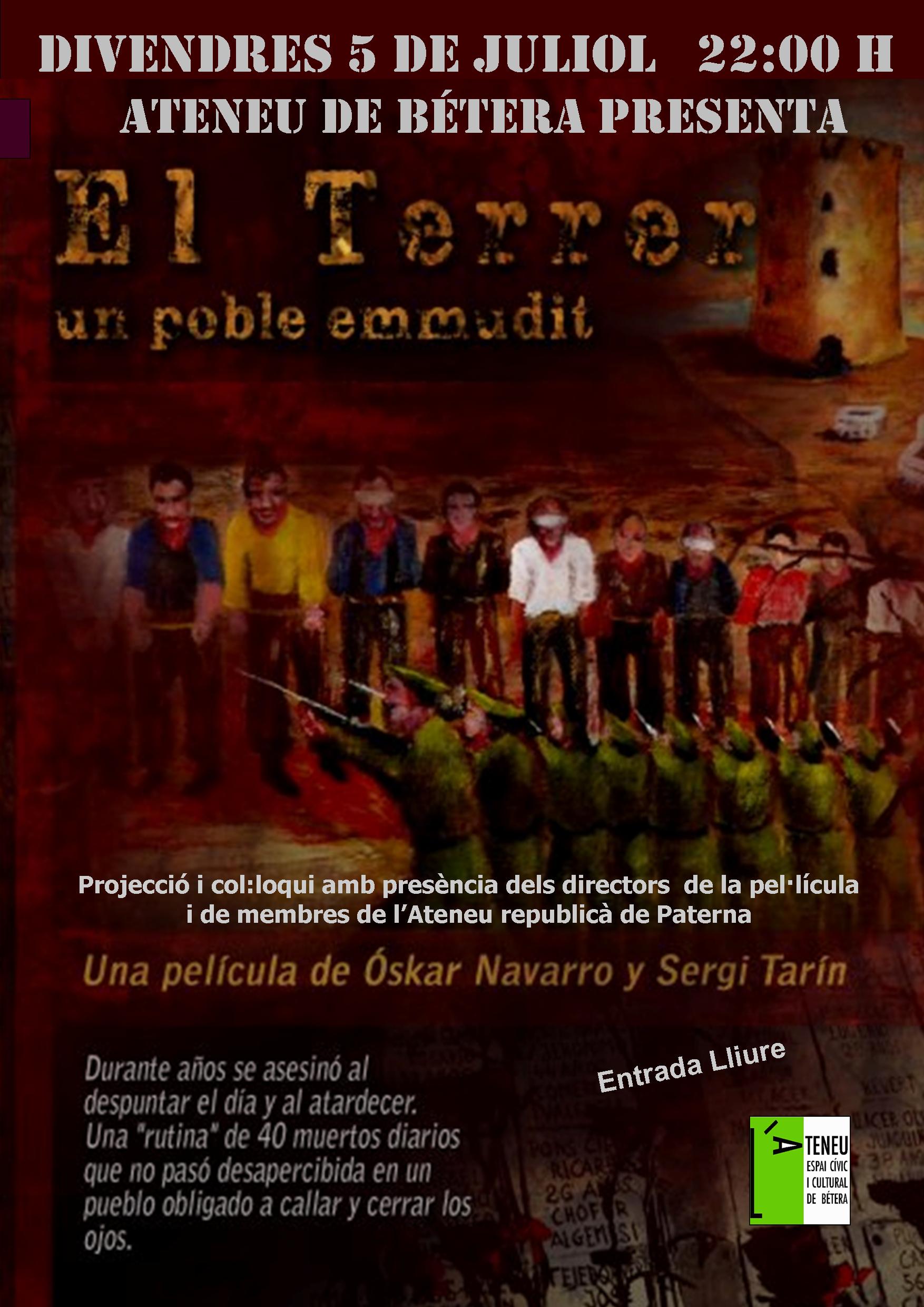 El Terrer cartellDivendres 5 de juliol, a les 22.00, projectem el film El Terrer, un poble emmudit, documental patrocinat per l’Ateneu Republicà de Paterna. En el col·loqui posterior comptarem amb la presència d’uns quants membres de l’Ateneu Republicà. SINOPSI: Entre 1939 i 1956, el franquisme va afusellar més de 2000 republicans a Paterna. Van ser anys de terror, de silenci, d’arbitrarietats, d’eliminació planificada i sistemàtica de qualsevol vestigi progressista. El documental retrata l’esforç col·lectiu del poble de Paterna per recuperar la memòria i la dignitat dels quals van morir per defensar la democràcia. Mostrat a través del punt de vista d’aquells protagonistes que es van veure silenciats i aquelles veus condemnades a l’oblit.