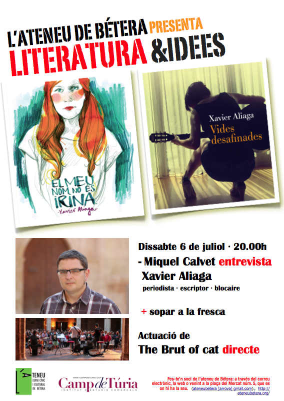 El dissabte 6, a les 19.30, el periodista de Bétera Miquel Calvet entrevistarà Xavier Aliaga, que parlarà dels llibres Vides desafinades i El meu nom no és Irina. Posteriorment hi haurà sopar popular, i l’actuació a les 22.30 de The Brut of Cat, que presentarà el disc Baix la pluja.