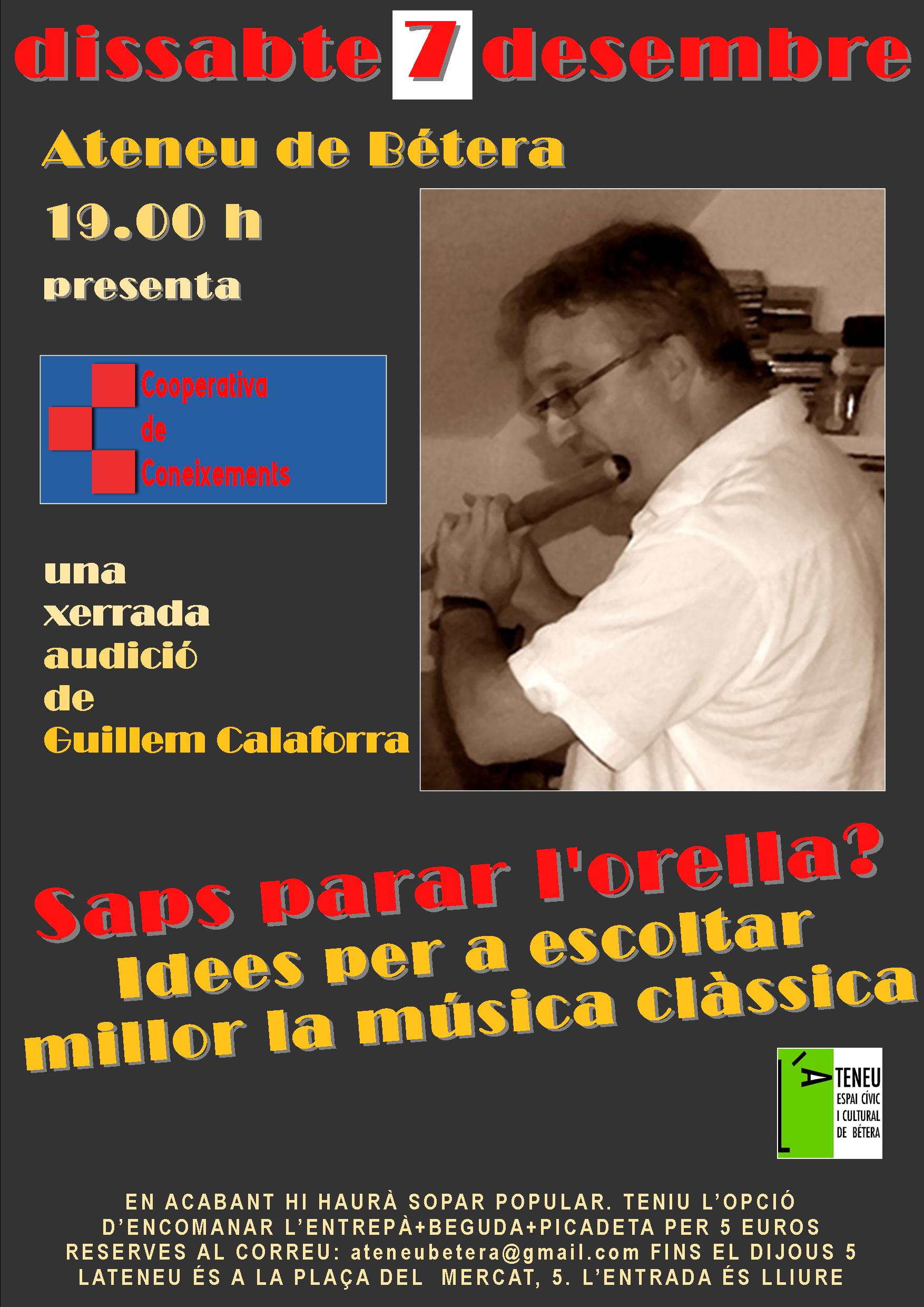 El dissabte 7 de desembre, a les 19.30, tindrà lloc una nova sessió de la Cooperativa de Coneixements, a càrrec de Guilllem Calaforra. Saps parar l’orella? Idees per a escoltar millor la música clàsssica, és un col·loqui animat per Calaforra, que en format taller intentarà donar algunes de les claus que ajuden a sentir millor aquesta música, a refinar el gust i a desenvolupar el criteri de l’oient. En acabant, sopar popular; podeu reservar entrepà+picadeta+beguda per 5 euros, fins el dijous 5, a ateneubetera@gmail.com.