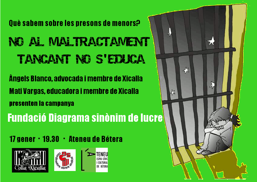 cartell_xicallaEl divendres 17 de gener la Colla Xicalla presentarà a l’Ateneu la campanya Fundació Diagrama, sinònim de lucre, sobre la situació que es viu als centres d’internament de menors. La campanya denuncia la lògica mercantil i financera que domina el sistema d’empresonament de menors, gestionat per empreses privades, l’opacitat de les quals en fa impossible el control. Organitzacions de drets humans han denunciat nombrosos casos de tortures i maltractaments dins aquests centres.