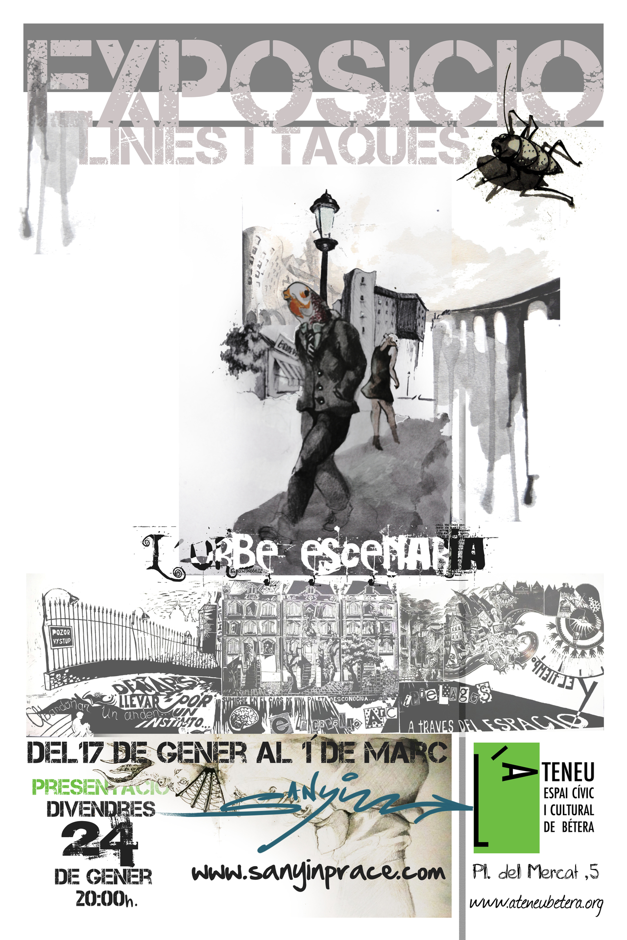 El divendres 24 de gener, a les 20.00, inaugurem una nova exposició a l’Ateneu; L’Urbe Escenaria, amb obres de l’artista local Sanyi. Ell mateix ens ho explica: Abandonar una andana, deixar-se endur per un impuls, sumir-se en el caos d’una paleta desconeguda , i anar creant arxipèlags a traves del espai i el temps”… Suggerències per recórrer aquest passeig d’imatges que ofereix el delit puntual d’un mon intrínsecfet a la mesura dels vianants, amb el fluir del pigment, el caràcter dels material i l’aventura del croma.