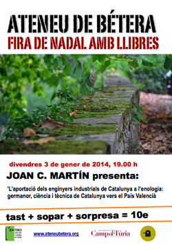 Joan C. Martín torna a l’Ateneu de Bétera per explicar-nos la relació industrial del Principat amb el País Valencià, com aquella relació va fer lluir la cultura i la indústria del vi entre els valencians. “L’aportació dels enginyers industrials de Catalunya a l’enologia (sobretot a la viticultura). germanor, ciència i tecnologia del Principat versus el País Valencià”.