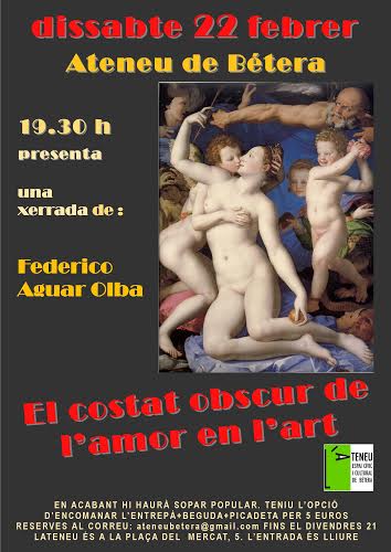 El dissabte 22 de febrer, a les 19.30, El costat obscur de l’amor en l’art, col·loqui amb Federico Aguar Olba. Encara que de professió és metge, Federico Aguar és un gran coneixedor de l’art i ja ha donat conferències a València en els darrers anys. El col·loqui tracta d’allò que la pintura, l’escultura, la literatura, el cinema i la música ens ensenyen sobre els costats foscos de l’amor.