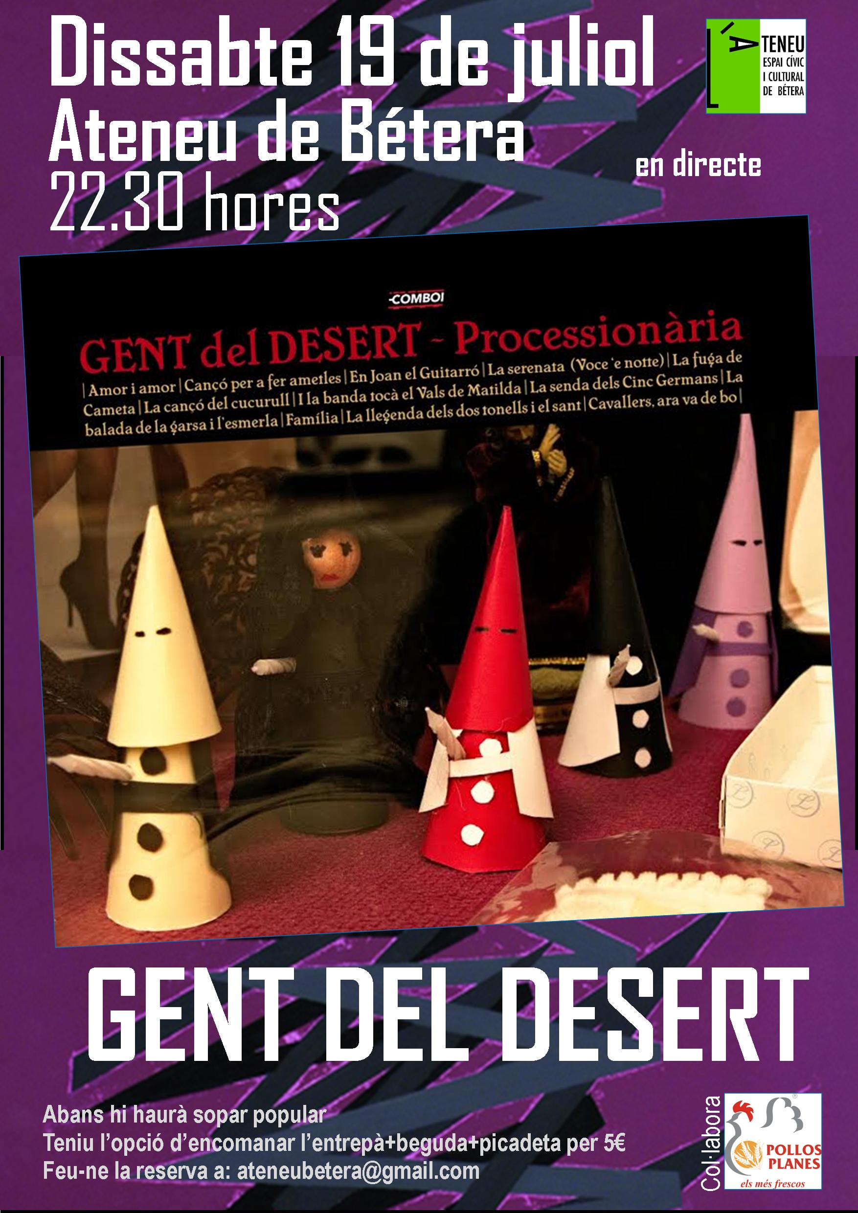 Dissabte 19 de juliol, a les 22.30, torna a l’Ateneu el grup Gent del Desert, que interpretarà en directe el seu darrer treball, Processionària. És un concert patrocinat per Pollos Planes. Podeu escoltar la música de Gent del Desert al seu Bandcamp.