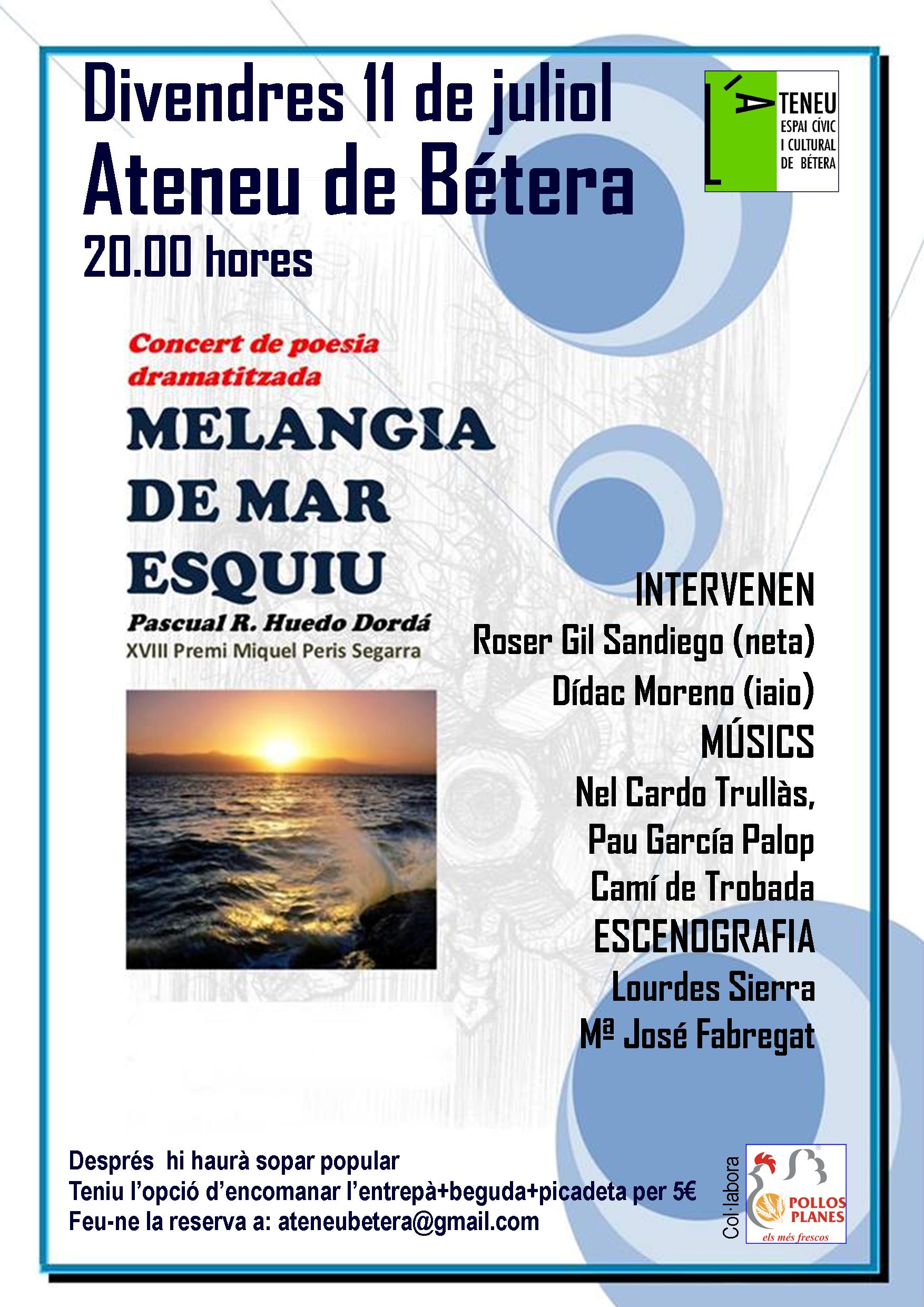 El divendres, 11 de juliol, a les  20.00, presentem a l’Ateneu Melangia de mar esquiu, un concert de poesia dramatitzada sobre una obra de Pascual R. Huedo. Intervindran Roser Gil Sandiego, en el paper de néta, i Dídac Moreno en el de iaio. Els músics seran Nel Cardo Trullàs, Pau Garcia Palop i el conjunt Camí de Trobada, i l’escenografia és de Lourdes Sierra i María José Fabregat.