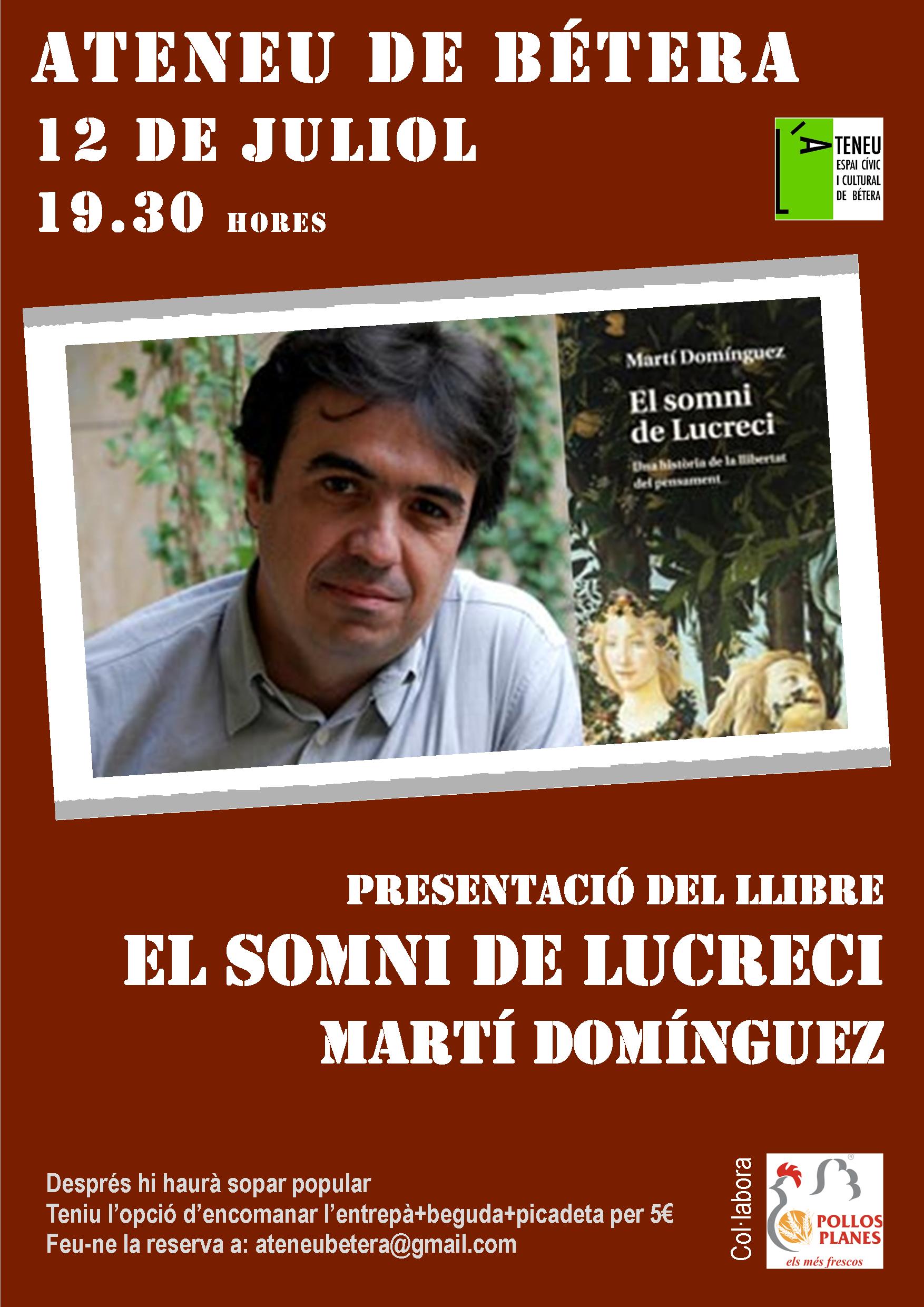 Dissabte, 12 de juliol, a les 19.30, presentem el llibre El somni de Lucreci (Grup 62, 2013). Es tracta d’una història de la llibertat de pensament de Martí Domínguez, amb la qual va guanyar el Premi Carles Rahola d’assaig 2013. Comptarem amb la presència de l’autor.