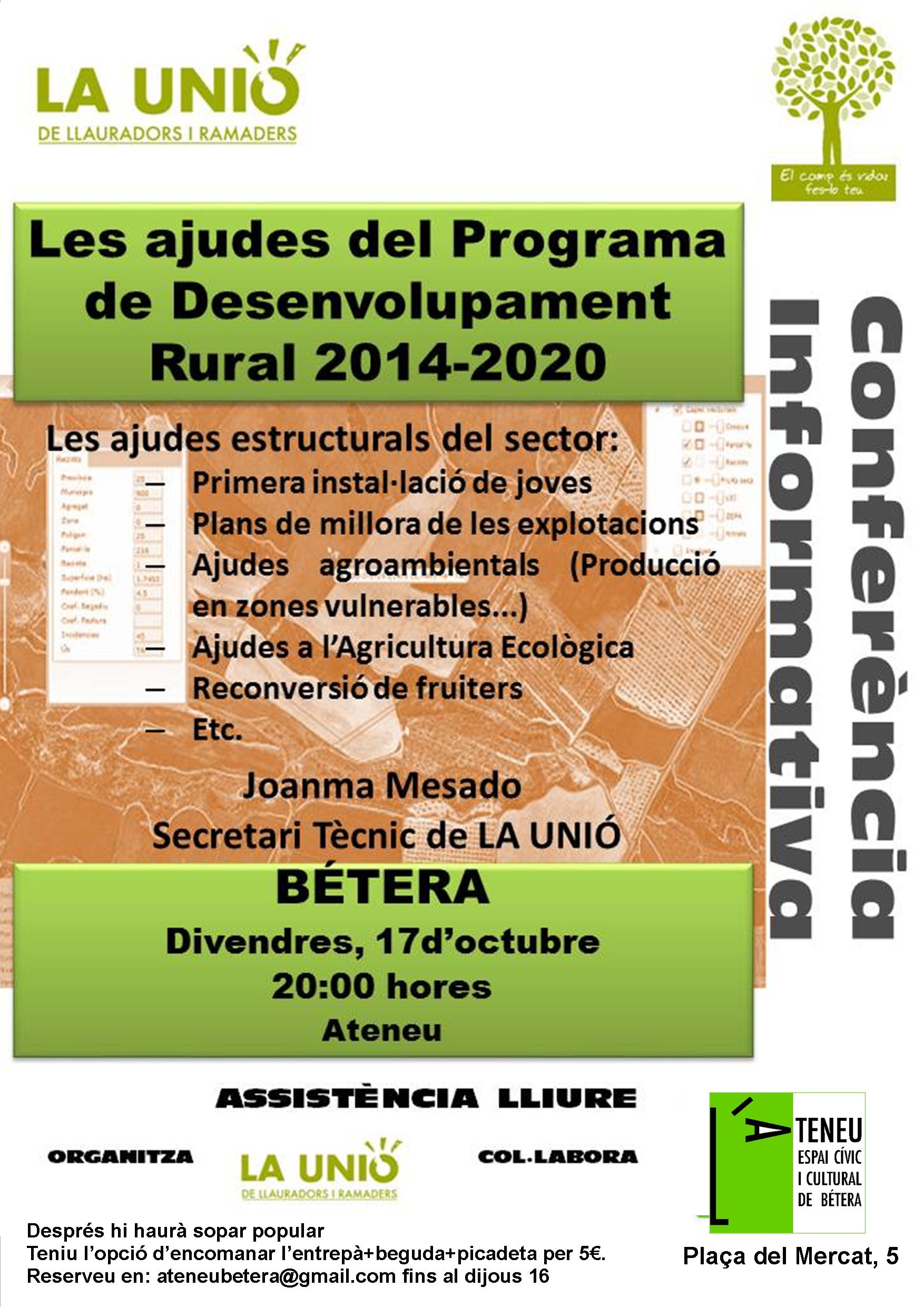 La Unió oct. 2014El divendres 17 d’octubre, a les 20.00, acollim una conferència informativa de la Unió de Llauradors i Ramaders, oberta al públic interessat. Joanma Mesado, secretari tècnic de la Unió, parlarà de les ajudes del Programa de Desenvolupament Rural 2014-2020. Es tracta d’ajuts estructurals del sector rural; primera instal·lació de joves, plans de millora d’explotacions, ajudes agroambientals, ajudes a l’agricultura ecològica, reconversió de fruiters, etc. En acabat hi haurà sopar popular; com és habitual podeu reservar entrepà+picadeta+beguda per 5 euros, fins dijous 16, a ateneubetera@gmail.com.