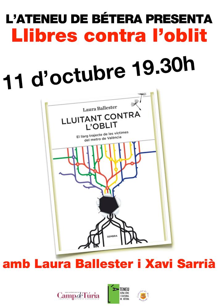 oblitEl dissabte 11 d’octubre, a les 19.30, presentem el llibre Lluitant contra l’oblit (Sembra Llibres, 2014), de la periodista Laura Ballester, amb la presència de l’autora i de Xavi Sarrià. El llibre compta amb el pròleg de Jordi Évole i l’epíleg de Beatriz Garrote, presidenta de l’Associació de Víctimes del Metro del 3 de juliol del 2006.