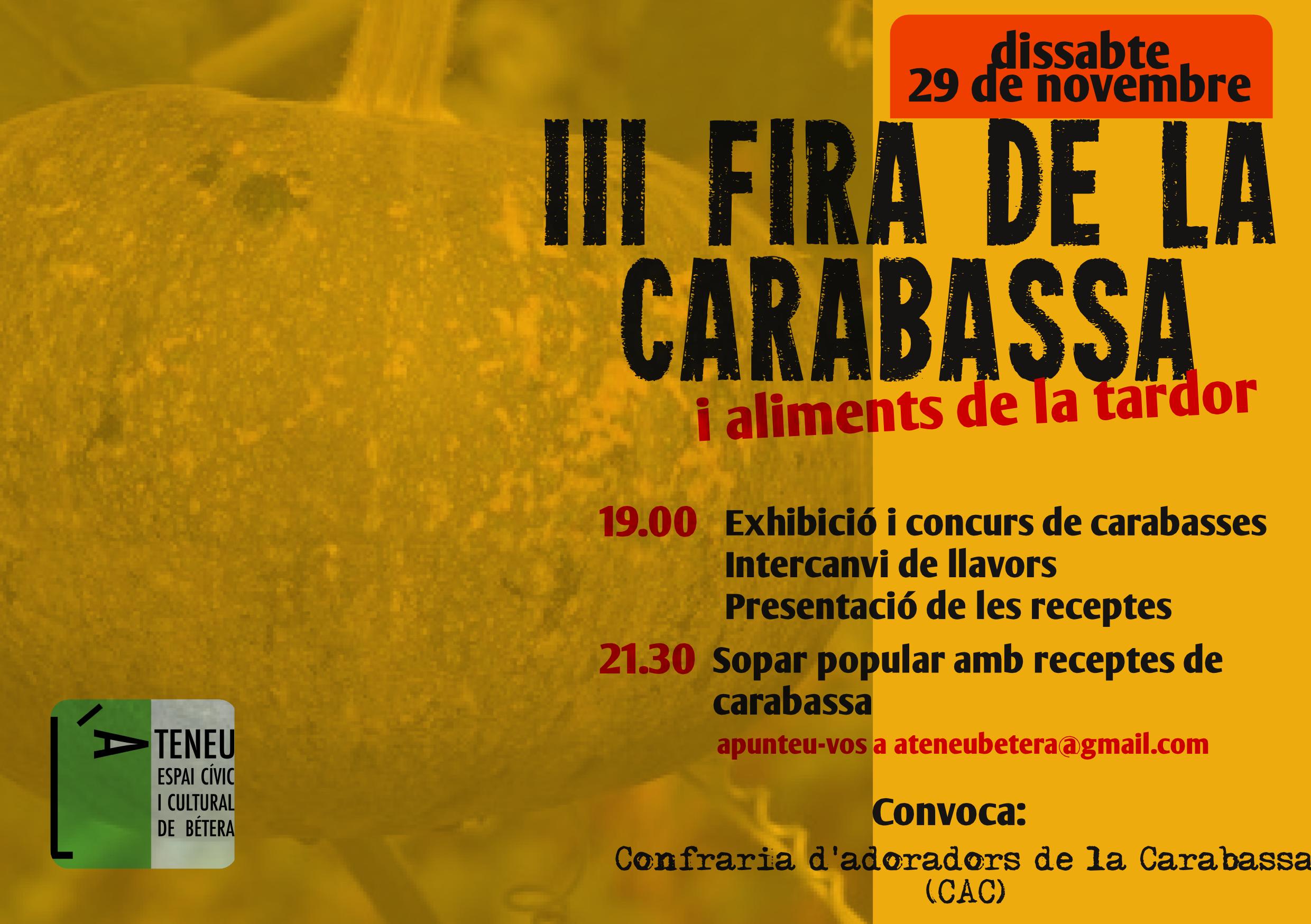 > El dissabte 29 de novembre recuperem la Fira de la Carabassa, que enguany fa la tercera edició. Com ja sabeu, podeu portar-hi les vostres receptes cuinades. Compartirem les diferents maneres de cuinar la carabassa per tal d’enriquir la nostra cultura culinària. Tastarem tots els plats, i aprofitarem per fer un sopar popular dedicat a la carabassa. Dolces o salades, tradicionals o innovadores; no deixeu de portar la vostra recepta. I si teniu carabasses de l’hort, porteu-les-hi també; admirarem la matèria primera. Hi haurà exhibició, concurs de carabasses, i intercanvi de llavors a partir de les 19.00, per després passar al sopar.