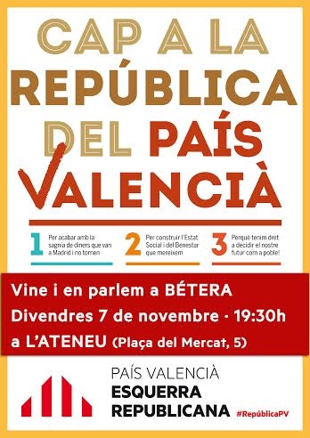 republicapvEl divendres 7 de novembre, a les 19.30, l’Ateneu acull un acte organitzat per Esquerra Republicana del País Valencià (ERPV).  L’acte, que comptarà amb la presència del president d’ERPV Agustí Cerdà, s’emmarca dins la campanya “Cap a la República del País Valencià” que du a terme aquest partit polític. Segons la presentació de la campanya, Cap a la República del País Valencià aborda els principals problemes que ens afecten com a valencians: