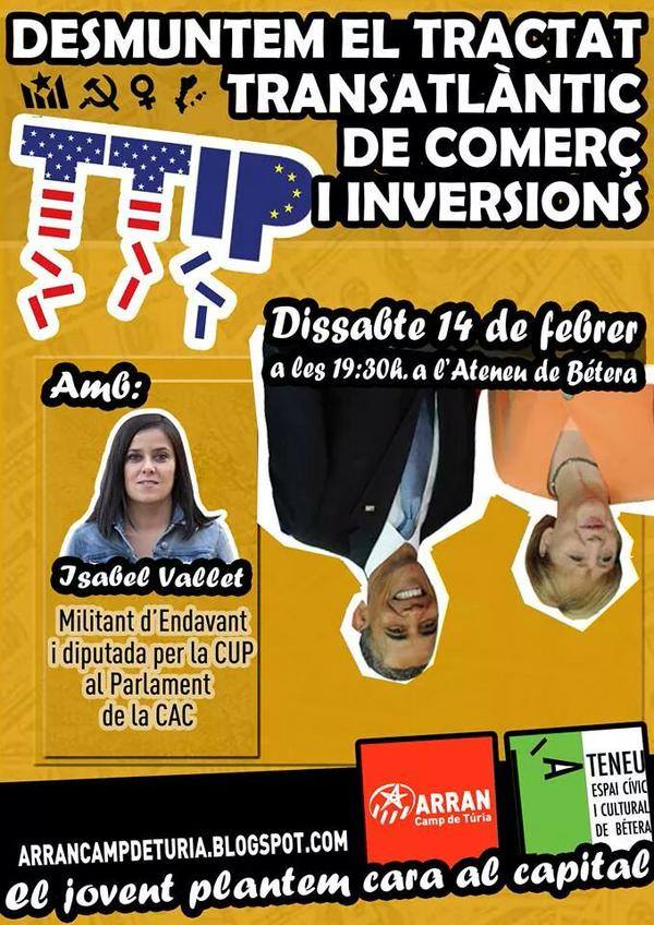 L’acte, organitzat per Arran Camp de Túria, té la intenció d’aprofundir en el TTIP i en les seues conseqüències. Comptarem amb la participació d’Isabel Vallet, diputada per la CUP al Parlament de Catalunya.