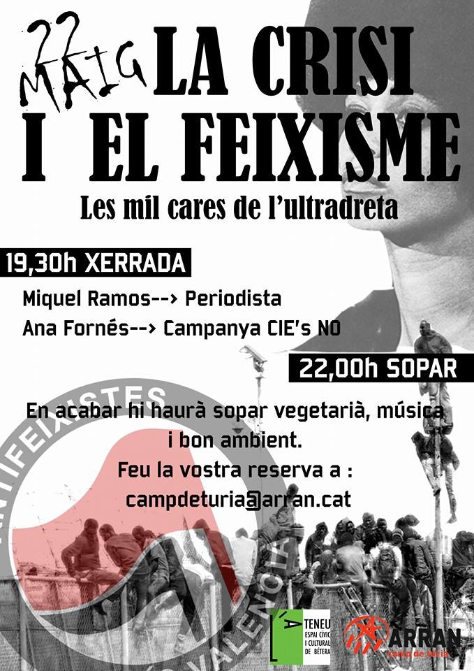 > A les 19.30 començarà el col·loqui La crisi i el feixisme. Les mil cares de la ultradreta, organitzat per Arran Camp de Túria. Comptarem amb la presència del periodista Miquel Ramos i de l’activista de la campanya CIE NO Ana Fornés; tots dos ens il·lustraran sobre el creixement dels moviments d’ultradreta en els temps de crisi que vivim. En acabant, sopar vegetarià, amb àpat compost de patés vegetals, cous-cous de verdures i fruita. El preu, sense beguda, serà de 5 euros; podeu reservar a campdeturia@arran.cat.