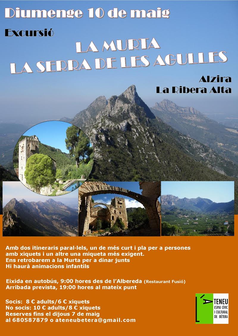 Diumenge 10 de maig anem d’excursió a la Murta i la Serra de les Agulles (Ribera Alta). Una excursió guiada per l’associació alzirenca l’Ullal de la Vila,  que ens farà conèixer un dels paratges valencians més singulars i emblemàtics. Podeu anar fent les reserves a ateneubetera@gmail.com.