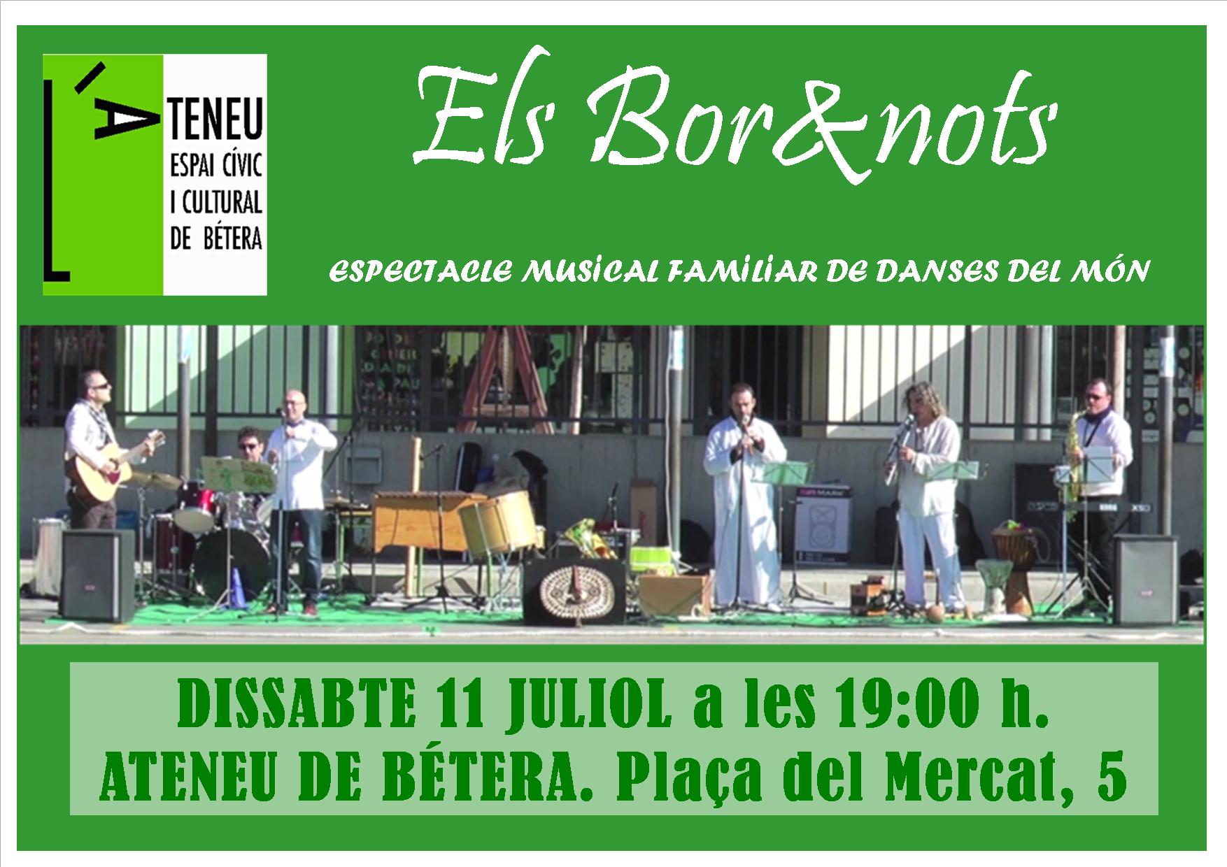 El dissabte 11 de juliol, a les 19.00, a la plaça del Mercat tindrem un espectacle per a públic familiar. El conjunt Bor&Nots ens proposa un espectacle titulat Danses multiculturals d’arreu del món. Si voleu ballar i gaudir de la música vos esperem a tots i a totes a la plaça!.