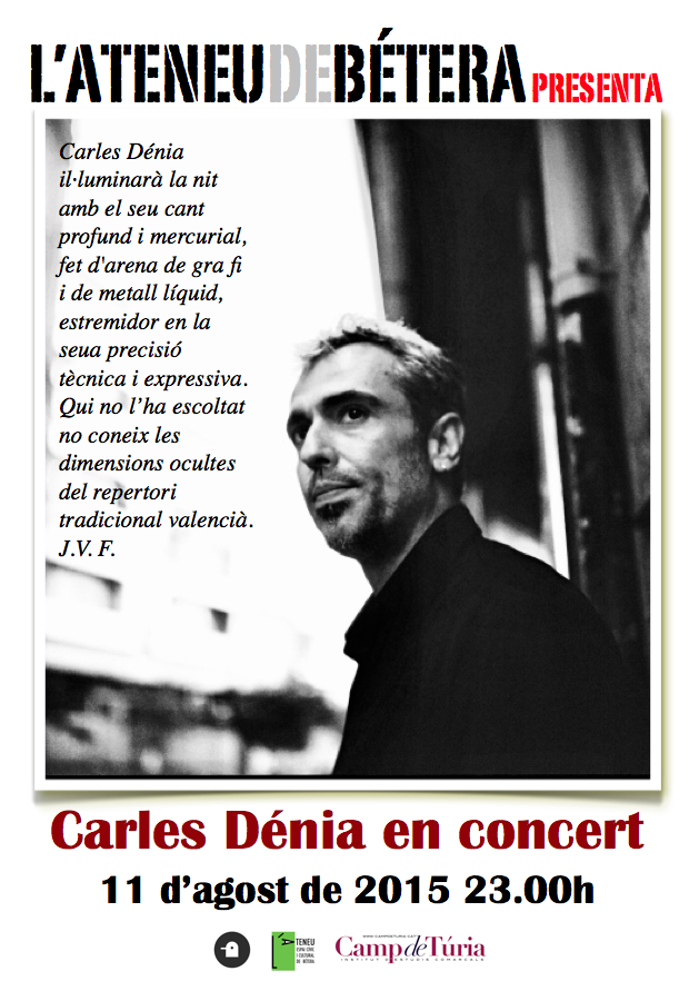 El dia 11 d’agost, a les 23.00, gaudirem d’un concert ben especial. Carles Dénia, cantaor i guitarrista, ens il·luminarà la vespra de la festa amb la seua música tradicional.