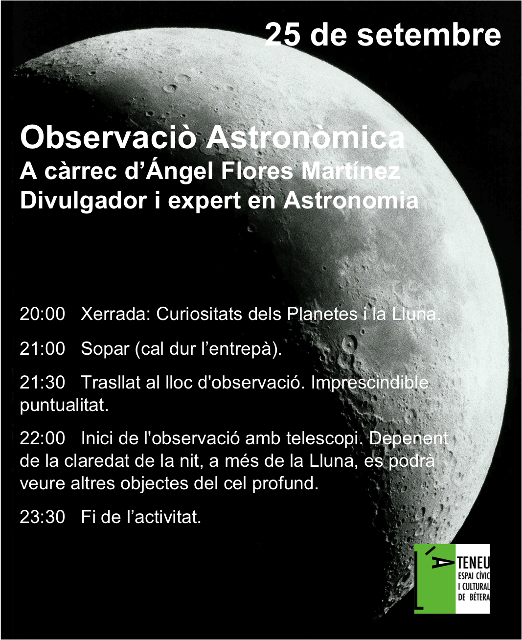Divendres, 25 de setembre, recuperem la jornada a l’observació astronòmica, de la mà d’Ángel Flores Martínez, expert en astronomia i divulgador. Si vos interessa reviseu el programa que figura al cartell; caldrà seguir l’horari amb puntualitat.