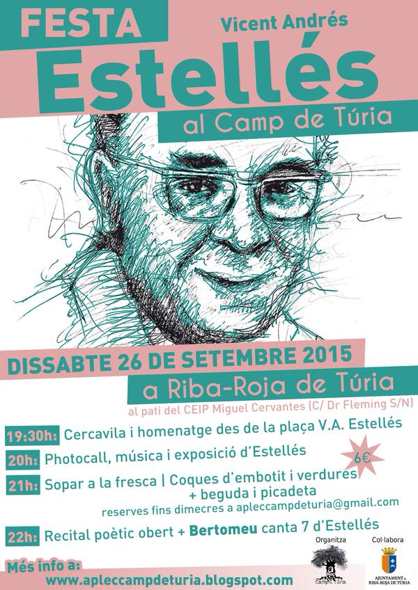 Dissabte, 26 de setembre, les entitats de la comarca agrupades sota l’Aplec del Camp de Túria organitzem la Festa Vicent Andrés Estellés. Enguany es farà a Riba-roja del Túria, al pati del CEIP Miguel Cervantes, al carrer Doctor Fleming S/N (mapa). Les activitats comencen a les 19.30, amb una cercavila. Les reserves pel sopar es poden fer, fins dimecres, a apleccampdeturia@gmail.com. No hi falteu!