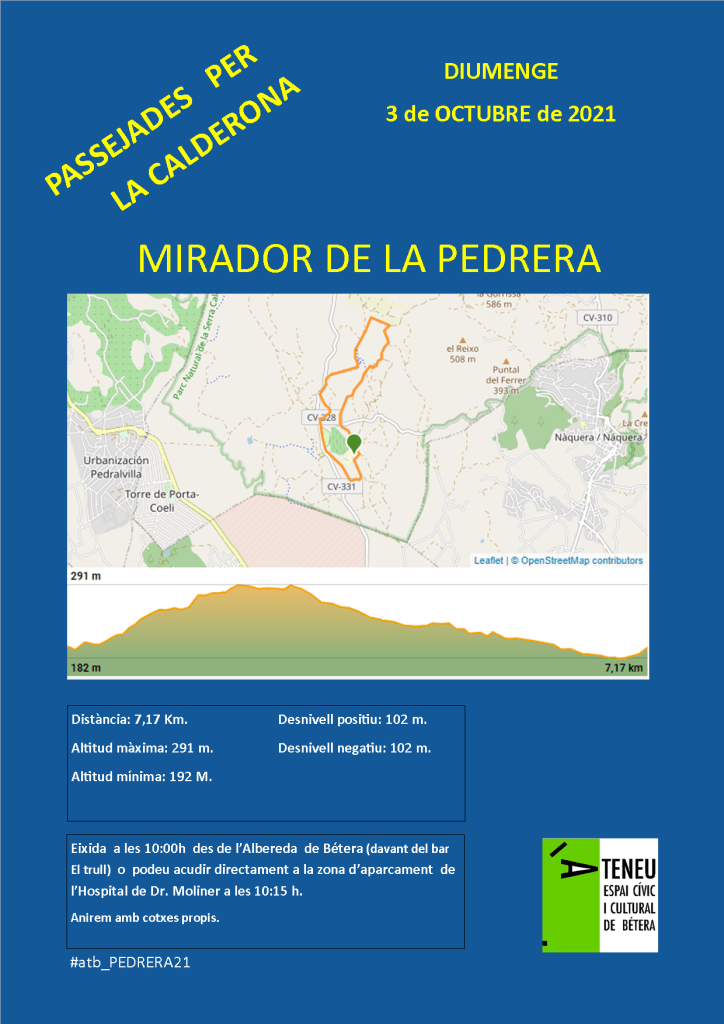 Eixida  a les 10:00h  des de l’Albereda  de Bétera (davant del bar El trull)  o  podeu acudir directament a la zona d’aparcament  de l’Hospital de Dr. Moliner a les 10:15 h.
