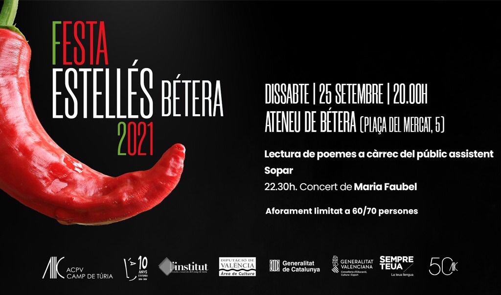 Dissabte 25: Festa Estellés amb lectura de poemes de vesprada i concert després de sopar de la jove cantautora de la comarca Maria Faubel.