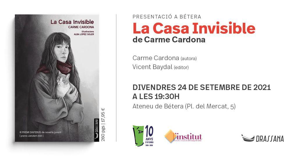 Divendres 24: Presentació del llibre La casa invisible, de Carme Cardona Bartual , guanyadora del Premi Diafebus de Novel·la Juvenil 2020.