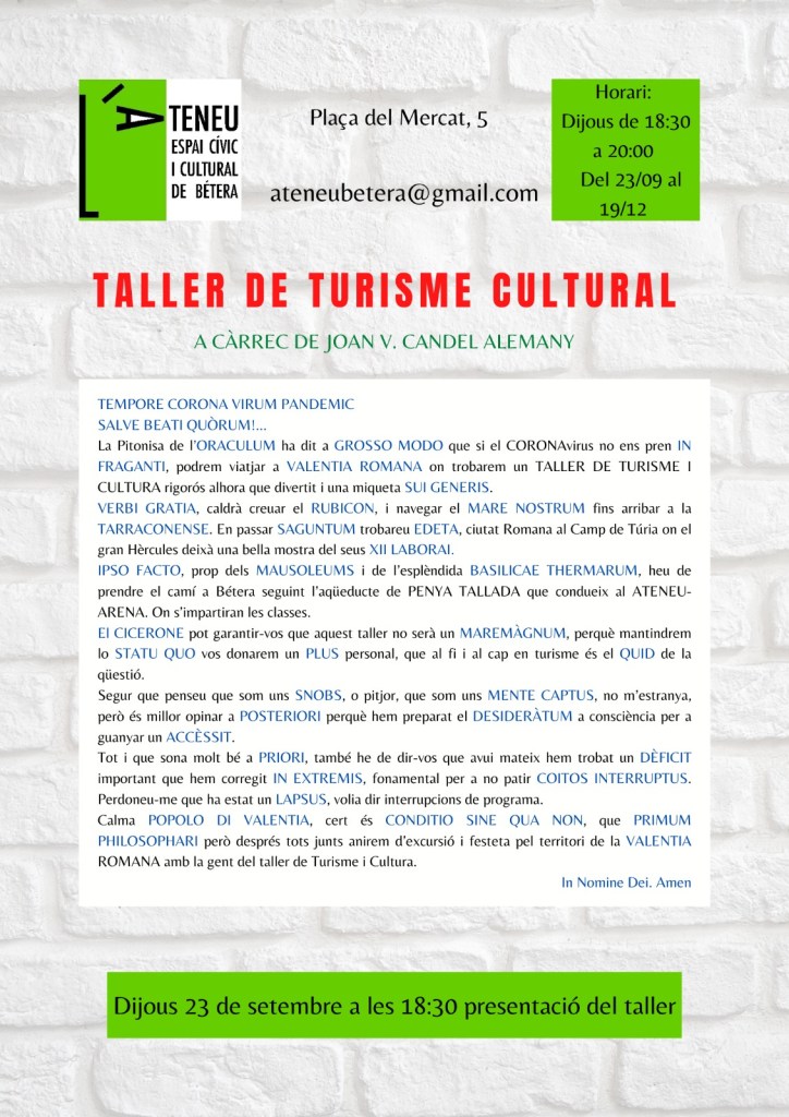 23 de setembre: sessió informativa oberta al púbilc sobre el Taller de Turisme Cultural a l’Ateneu de Bétera