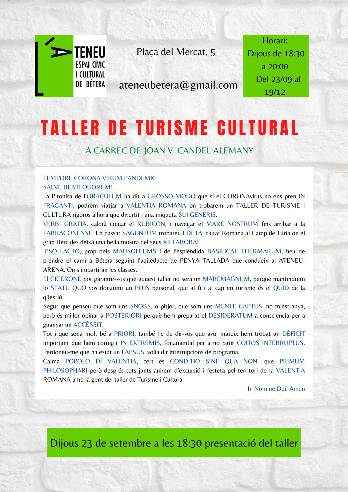 – Els dijous: TALLER de TURISME CULTURAL a càrrec de JOAN V. CANDEL a les 18:30 h.