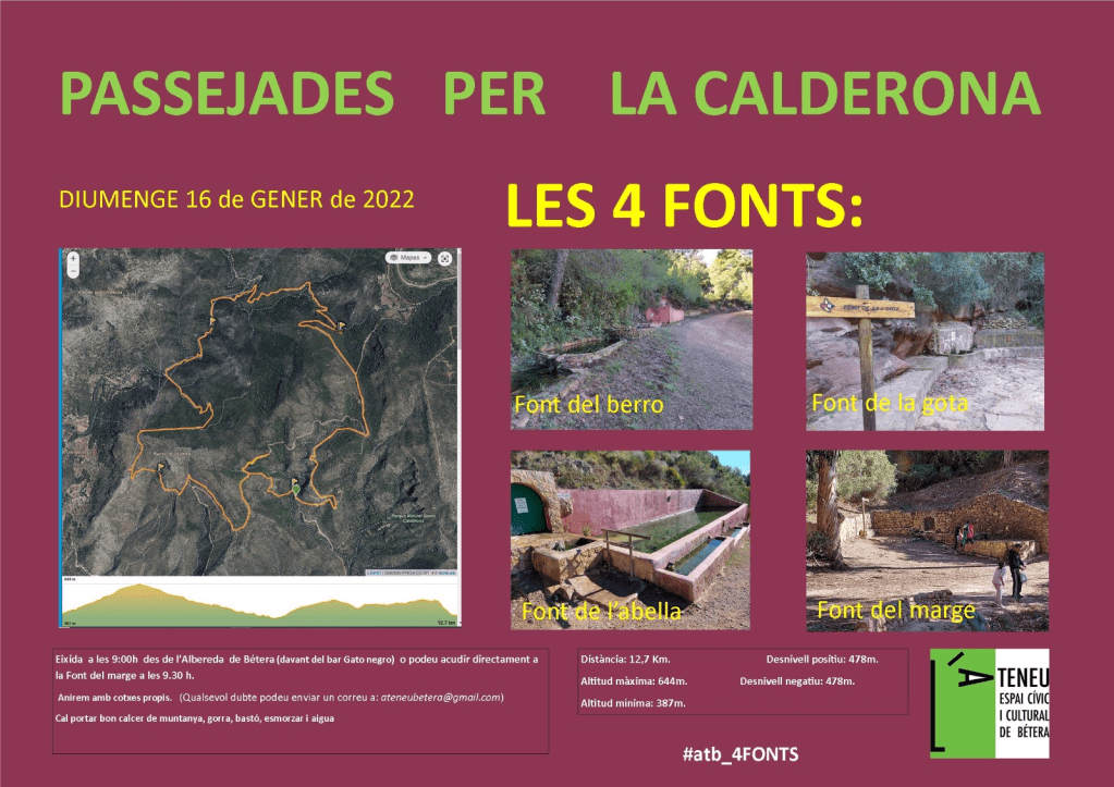 Eixida a les 9:00h des de l’Albereda de Bétera (davant del bar Gato negro) o podeu acudir directament a la Font del Marge a les 9.30 h. Anirem amb cotxes propis. Distància: 12,10 Km. Desnivell positiu: 478m. Altitud màxima: 644m. Altitud mínima: 387m. #AtB_4FONTS(Qualsevol dubte podeu enviar un correu a: ateneubetera@gmail.com)