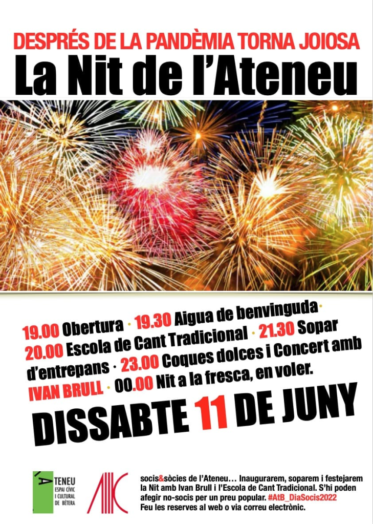 la vesprada-nit del dissabte 11 de juny torna la Festa de les persones associades, amb el final de curs de l’escola de cant valencià, el concert del poeta i cantautor valencià Ivan Brull i, com sempre, algunes sorpreses.