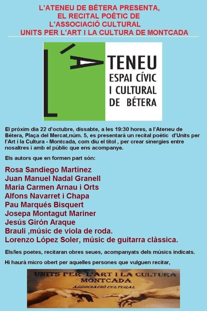 Us presentem la segona jornada de col·laboració entre l’Associació Cultural Units per la Cultura de Montcada i l’Ateneu de Bétera. Dissabte, a les 19:30h, recital poètic a l’Ateneu.