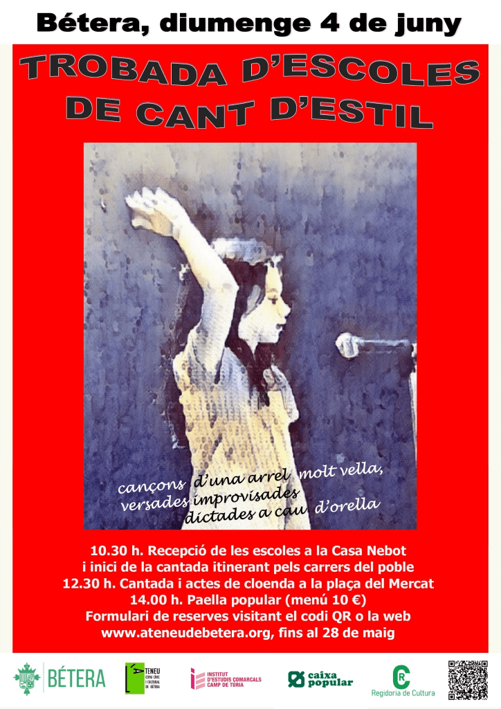 Bétera acull la primera trobada d’escoles de cant d’estil el proper diumenge 4 de juny organitzada per l’Ateneu de Bétera, l’Insitut d’Estudis Comarcals del Camp de Túria i la regidoria de Cultura de l’Ajuntament d’aquest municipi. Els actes començaran a les 10.30 hores amb la recepció de les escoles a la Casa Nebot. Tot seguit, s’iniciarà una cantada itinerant pels carrers de la vila. A la Plaça del Mercat, on tindran lloc la cantada final i els actes de cloenda.