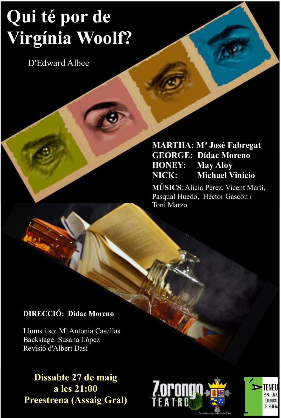 El dissabte 27 de maig a les 21:00  no us podeu perdre l’assaig general de Zorongo Teatre i la seua personal versió del clàssic Qui té por de Virginia Woolf?