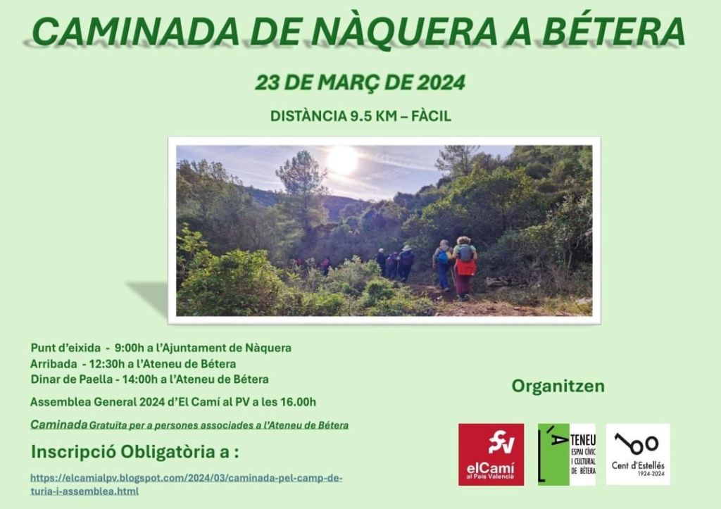 El proper dissabte, 23 de Març, farem una camina fàcil, amb els amics d’ El Camí al País Valencià. En acabar, dinarem paella, a l’ateneu.