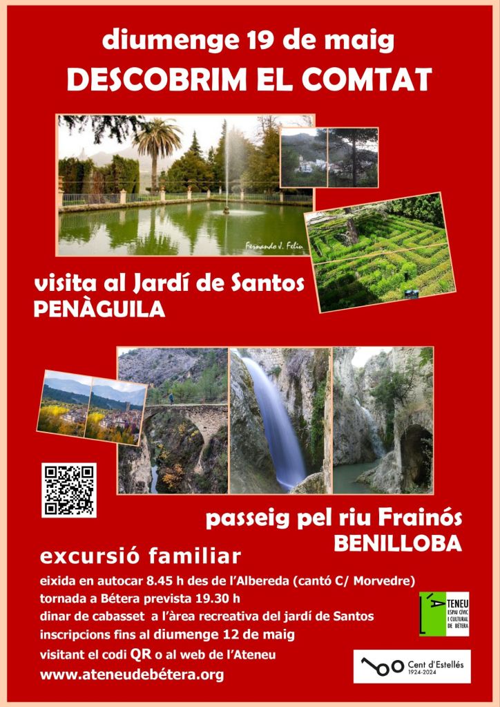 T’animem a celebrar la primvera. Vine amb l’Ateneu a descobrir la comarca d’El Comtat. Et proposem visitar el jardí històric de Santos a Penàguila, el somni fet realitat del terratinent i industrial il.lustrat Joaquin Rico, que va construir, en la primera meitat del segle XIX, aquest jardí romàntic al peu de la serra d’Aitana, prop del poble de Penàguila. També farem, a Benilloba, un passeig circular d’uns 4 km. pels molins del riu Frainós, un rierol que recull les aigües del vessant occidental d’Aitana i ès tributari del Serpis.