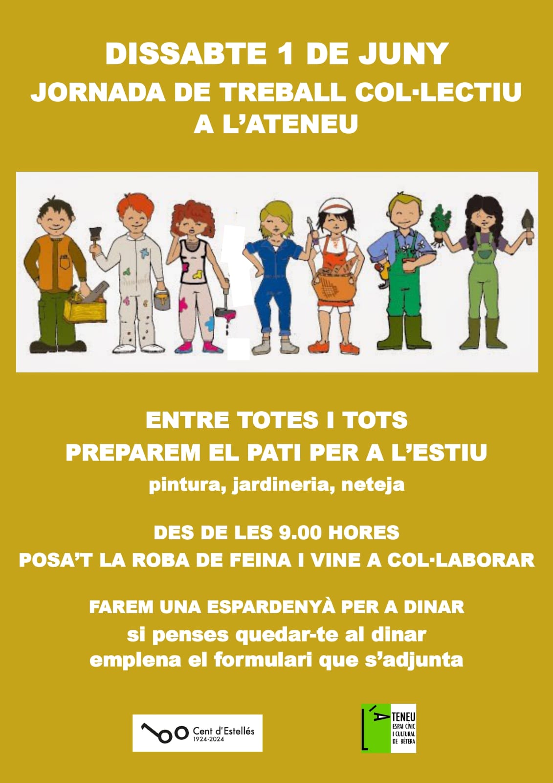 Dediquem el matí del pròxim dissabte 1 de juny a endreçar el pati, el lloc on es faran la majoria d’activitats de l’estiu a l’Ateneu. Necessitem la teua ajuda durant unes hores. En acabant dinarem junts, Joano Baudés ens preparà una espardenyà (a càrrec de l’Ateneu).